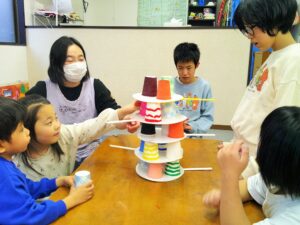 ジェンガ遊びでは、バランスを考えながら優しく。