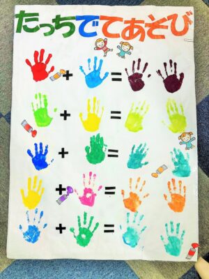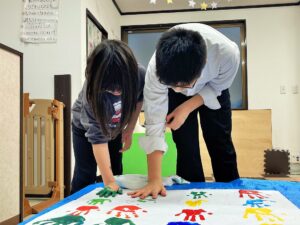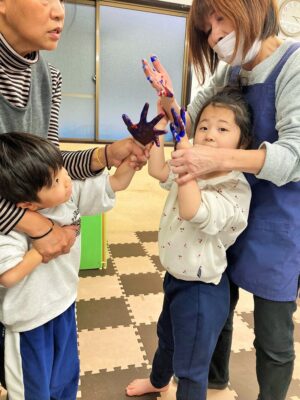 手にいっぱい絵の具をつけてお互いに握手。